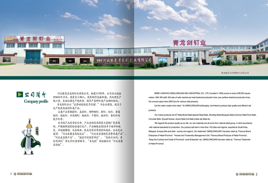 河北隆堯青龍劍釘業有限公司,始建于1992年,公司共占地面積96000平方米,現有員工380人,現有制釘設備400套,熱處理生產線六條,表面處理生產線兩條,現年產各種釘類產品28000余噸。