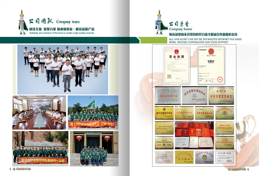 公司視產品質量如生命,產品全部采用國家大型鋼廠優質線材,嚴格按照國家標準進行生產,產品暢銷全國120多個城市和地區,并遠銷韓國、馬來西亞、歐美及非洲等國家和地區。企業先后獲得:“河北省著名商標企業”、“河北省首屆特色消費滿意產品”、“河北省名牌產品”、“誠實守信經營單位”、“省級守合同、重信用單位”等眾多的 榮譽稱號。“青龍劍”商標被評為“河北省著名商標”。